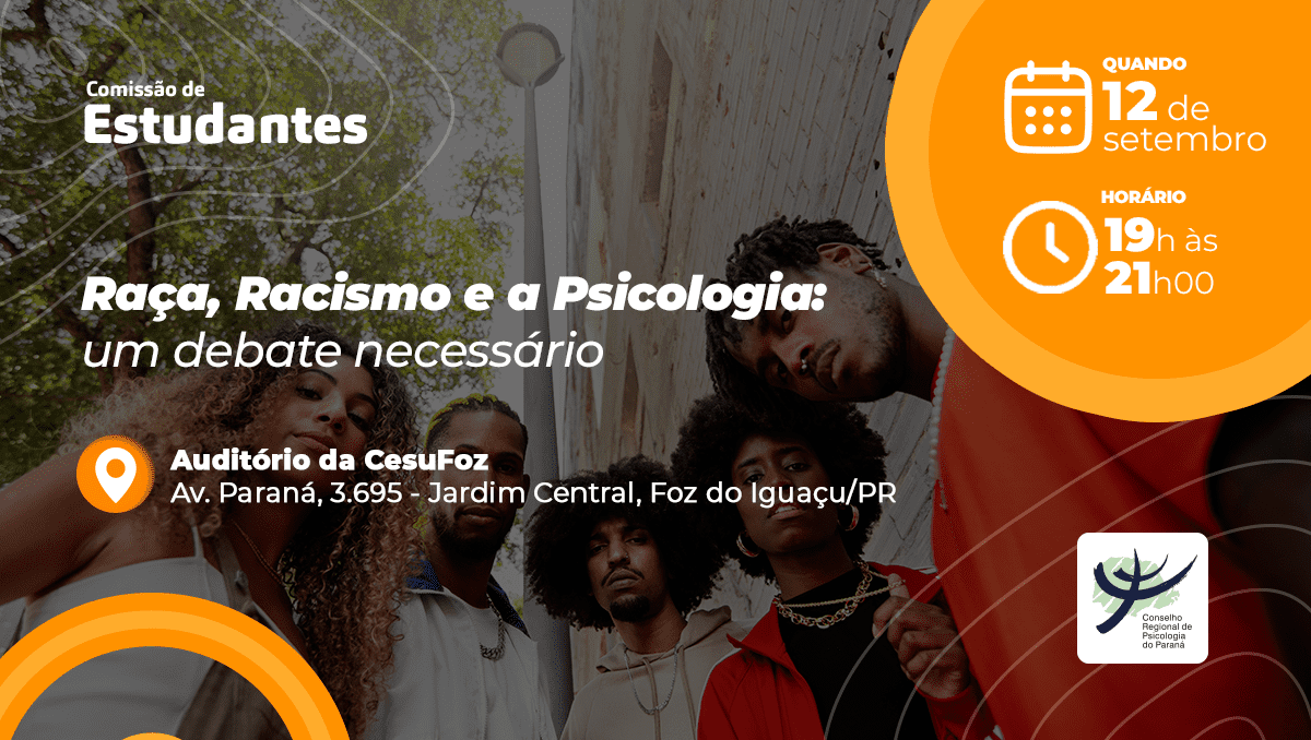O Conselho Regional de Psicologia do Paraná (CRP-PR) realizará, no dia 12 de setembro, às 19h, a roda de conversa “Raça, racismo e a Psicologia: um debate necessário”, no Auditório da Faculdade Cesufoz, em Foz do Iguaçu. O encontro tem como objetivo promover um espaço de reflexão crítica sobre o racismo científico, o silenciamento de conteúdos raciais na formação em Psicologia e os impactos dessa ausência na prática profissional.