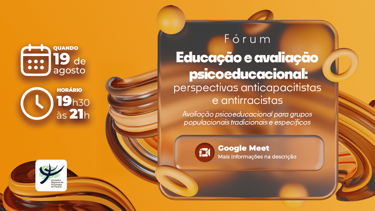 Como parte do evento “Educação e avaliação psicoeducacional: perspectivas anticapacitistas e antirracistas”, promovido pelas Comissões de Psicologia Escolar e da Educação, de Avaliação Psicológica e Anticapacitista, o CRP-PR realizará uma série de encontros online via Google Meet com a finalidade de aprofundar o debate que será iniciado durante a abertura do evento, no dia 14 de agosto, a partir das 19h30, na UNIPAR, campus de Francisco Beltrão.