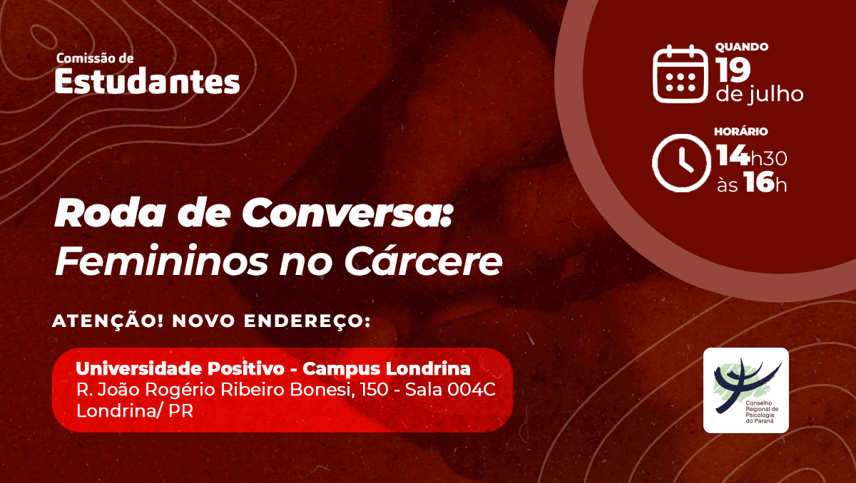 O Conselho Regional de Psicologia do Paraná (CRP-PR) convida toda a categoria para participar da roda de conversa “Femininos no Cárcere”, que será realizada no próximo dia 19 de julho (sábado), das 14h30 às 16h. A atividade tem como propósito oferecer um espaço de diálogo e reflexão sobre a realidade vivida por mulheres privadas de liberdade e os desafios ético-políticos enfrentados pela Psicologia em sua atuação junto a esse público.