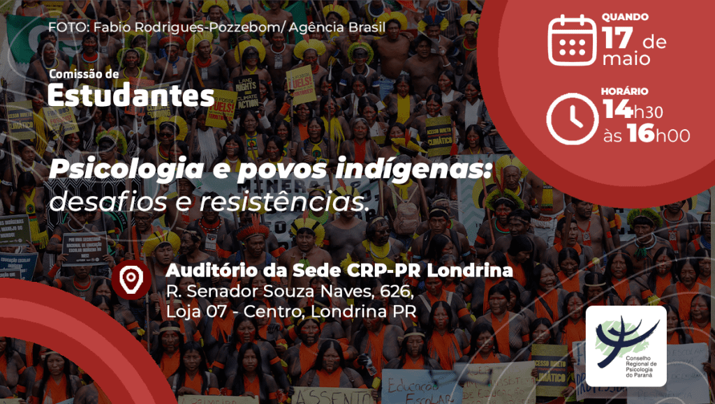 A Comissão de Estudantes de Londrina promoverá no próximo sábado, 17 de maio, das 14h30 às 16h na sede do CRP-PR de Londrina, a reunião temática “Psicologia e povos indígenas: desafios e resistências”. Este evento cria um espaço de diálogo horizontal entre estudantes, profissionais e representantes indígenas, promovendo a visibilidade das resistências e das formas próprias de cuidado produzidas pelas comunidades originárias. A atividade também tem o objetivo de denunciar os processos de exclusão, racismo e violência institucional.